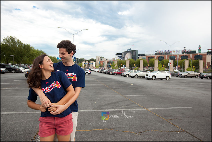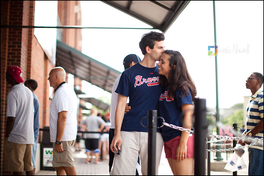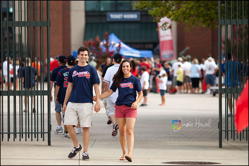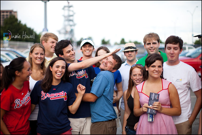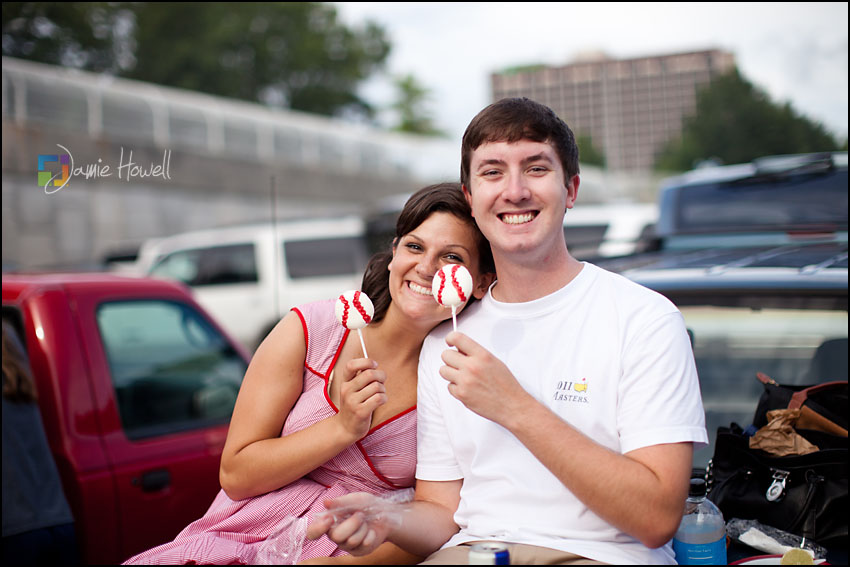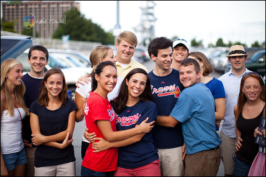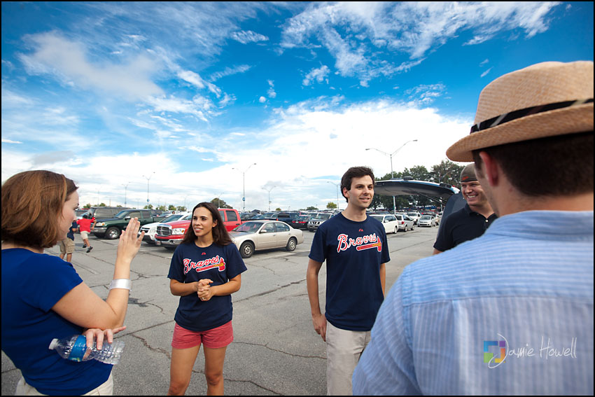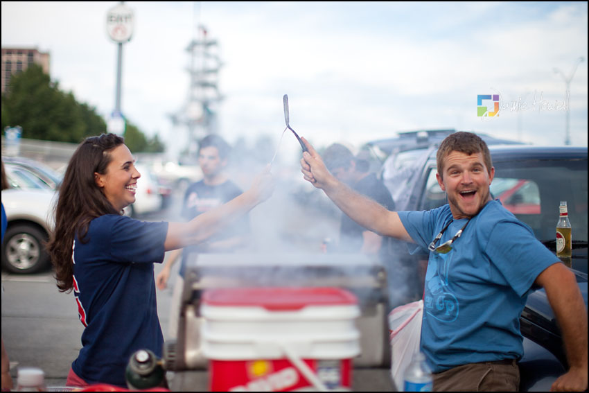 I love a change of pace and this session was definitely a change of pace. Meagan and Dan were having an engagement tailgating party at Turner Field and wanted me to come photograph it. Mostly this was a couple hanging out and spending time with some good friends before the game. We dodged rain a couple hours earlier and strict parking lot police at the stadium who made us take the tents down (for a tailgate – who knew?). Nevertheless, a great time was had by all. Here are some of my favorites: